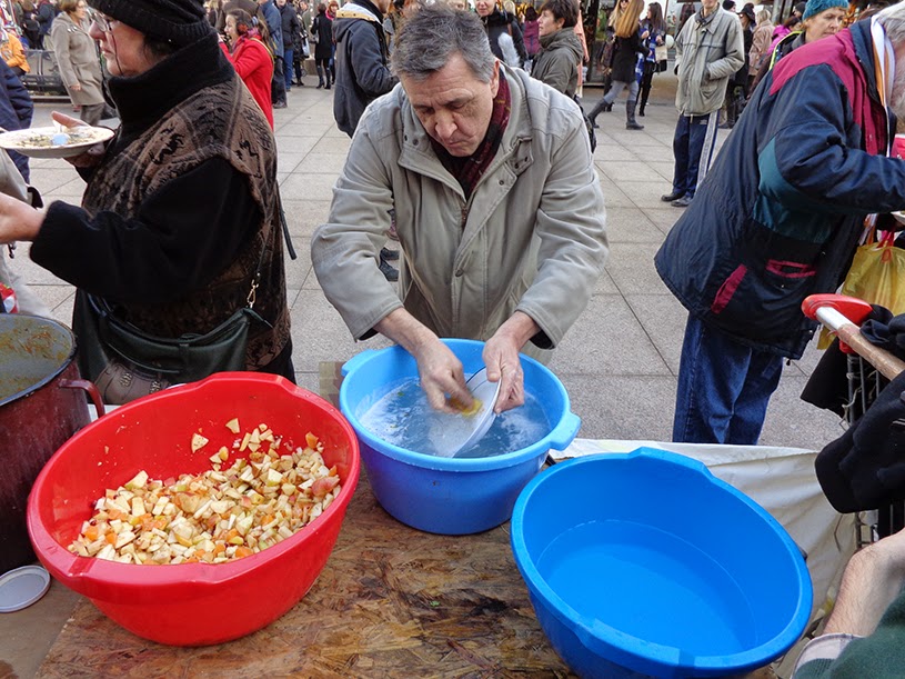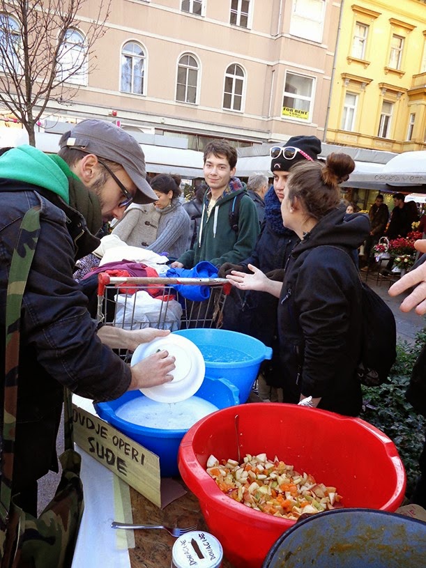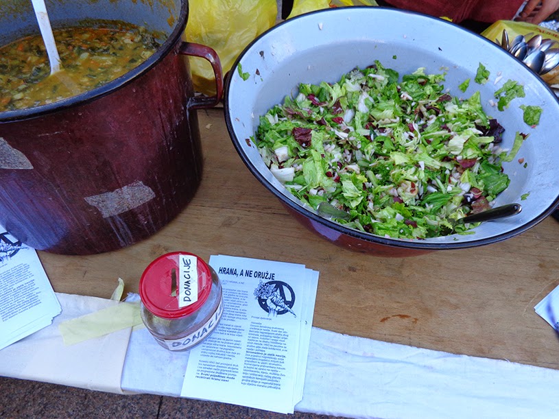 Hrana, a ne oružje aktivisti/aktivistkinje su u subotu dijelili hranu koja je sakupljena na zagrebačkim tržnicama Dolac i Trešnjevka. Podijeljeno je nekoliko kila kruha, kazan variva od blitve i ostalog povrća, kazan rižota, dvije velike posude salate od povrća i salate od voća, te dvije kutije doniranih batata. Uz to, bilo je i obilje zimske odjeće koju su jedni ljudi donosili, a drugi odnosili sa sobom. U ovo vrijeme je bitno poticati ljude na solidarnost, na razmjenu, nasuprot pomahnitaloj potrošačkoj groznici koja vlada u ovo pred blagdansko vrijeme, te nasuprot podivljalim  političarima (vodećih stranaka u HR) koji za nadolazeće izbore nemilosrdno sakupljaju bodove za svoje licemjerne kampanje.